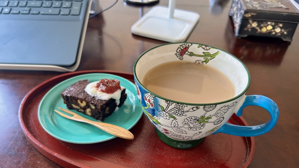 作業の合間に甘い時間を少しだけ!ほうじ茶ラテとホームメイドのブラウニー